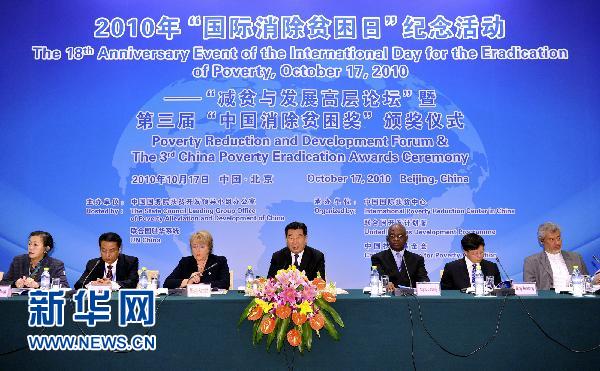 10月17日是“国际消除贫困日”,减贫与发展高层论坛在北京举行。中共中央政治局委员、国务院副总理回良玉在开幕式上致辞,并为“中国消除贫困奖”获奖者颁奖。新华社记者 黄敬文 摄