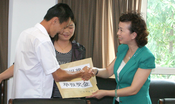 省农产品和农资产品打假专项行动小组根据《广东省农产品和农资产品打假举报奖励办法》,给予上述3位举报人各奖励5000元。程萍副厅长给3位举报人颁发了奖金,感谢他们对省农业厅“三打两建”工作的积极参与和支持,鼓励他们坚定信念,相信各级政府及其有关部门有能力维护公平和正义,也有责任为民办实事、办好事,希望他们继续关注和支持“三打两建”工作,做守法、诚信模范。