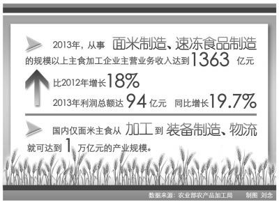 主食加工业是传统食品产业现代化的一大领域。据统计,2013年,从事面米制造、速冻食品制造的规模以上主食加工企业主营业务收入达到1363亿元,比2012年增长18%;利润总额94亿元,同比增长19.7%。