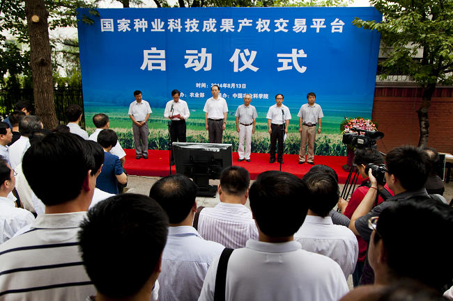 8月13日,农业部副部长余欣荣、中国农业大学戴景瑞院士、中国农业科学院党组书记陈萌山、农业部种子管理局局长张延秋共同为国家种业科技成果产权交易中心揭牌。