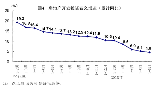 上半年,全国房地产开发投资43955亿元,同比名义增长4.6%(扣除价格因素实际增长5.7%),增速比一季度回落3.9个百分点,其中住宅投资增长2.8%。房屋新开工面积67479万平方米,同比下降15.8%,其中住宅新开工面积下降17.3%。全国商品房销售面积50264万平方米,同比增长3.9%,一季度为同比下降9.2%,其中住宅销售面积增长4.5%。全国商品房销售额34259亿元,同比增长10.0%,其中住宅销售额增长12.9%。房地产开发企业土地购置面积9800万平方米,同比下降33.8%。6月末,全国商品房待售面积65738万平方米,同比增长20.8%。上半年,房地产开发企业到位资金58948亿元,同比增长0.1%。
