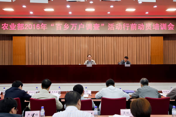 农业部网讯 5月4日,农业部召开2016年“百乡万户调查”活动行前动员培训会。农业部副部长余欣荣在会上强调,要以实际行动贯彻落实习近平总书记在安徽小岗村召开的农村改革座谈会上的重要讲话精神,按照部党组要求,深入农民群众,宣传“三农”政策,切实解决难题,用创新的思想和方法解决新问题、实现新突破,确保调查工作取得实效。