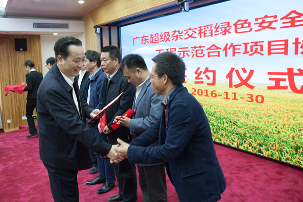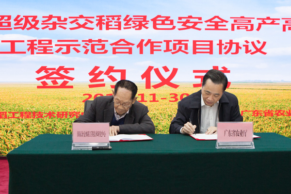 根据协议,双方通过实施“广东超级杂交稻绿色安全高产高效示范工程合作项目”,共同推进农科教、产学研协同创新机制,加快提升合作区域超级杂交稻生产水平与种植面积,推广经农业部确认的超级稻品种,努力实现超级稻大面积“绿色安全高产高效”目标。同时开展双季超级杂交稻每公顷22.5吨的高产攻关。国家杂交水稻工程技术研究中心每年提供2-3个左右超级杂交稻苗头组合参加广东省区试,并参加项目试验、示范。另外,将双方第一阶段合作研究成果--国家杂交水稻工程技术研究中心培育的抗稻瘟病新品种—Y两优143和Y两优305作为合作项目主推品种在广东适宜的生态区域大面积推广。