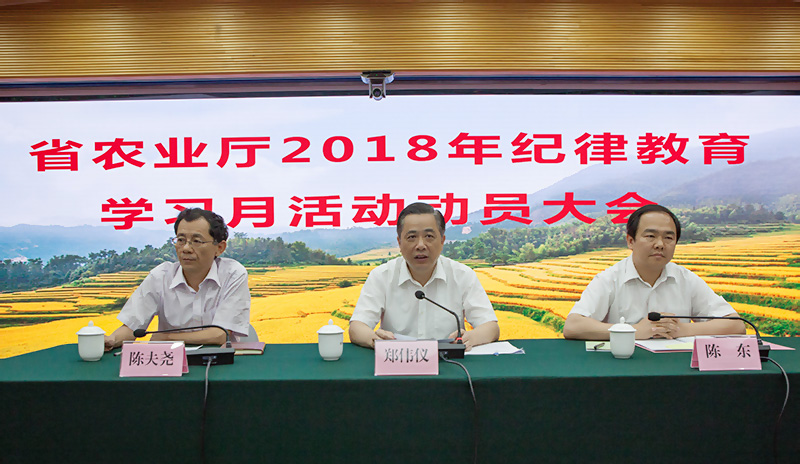 8月9日下午,广东省农业厅召开2018年纪律教育学习月活动动员大会。厅党组书记、厅长郑伟仪同志主持会议并作题为《以党的政治建设为统领 严明党的纪律 大力营造风清气正的良好政治生态》专题党课辅导报告。省纪委、监委驻省农业厅纪检监察组组长、厅党组成员陈夫尧同志代表厅党组对2018年纪律教育学习月活动进行了部署。厅机关副处级以上干部、事业单位领导班子成员近120人参加了会议。