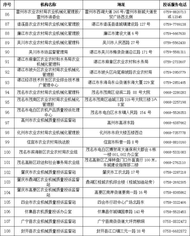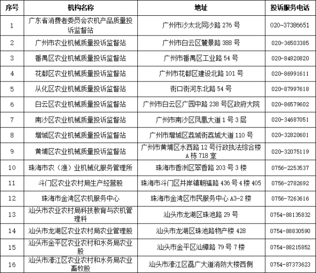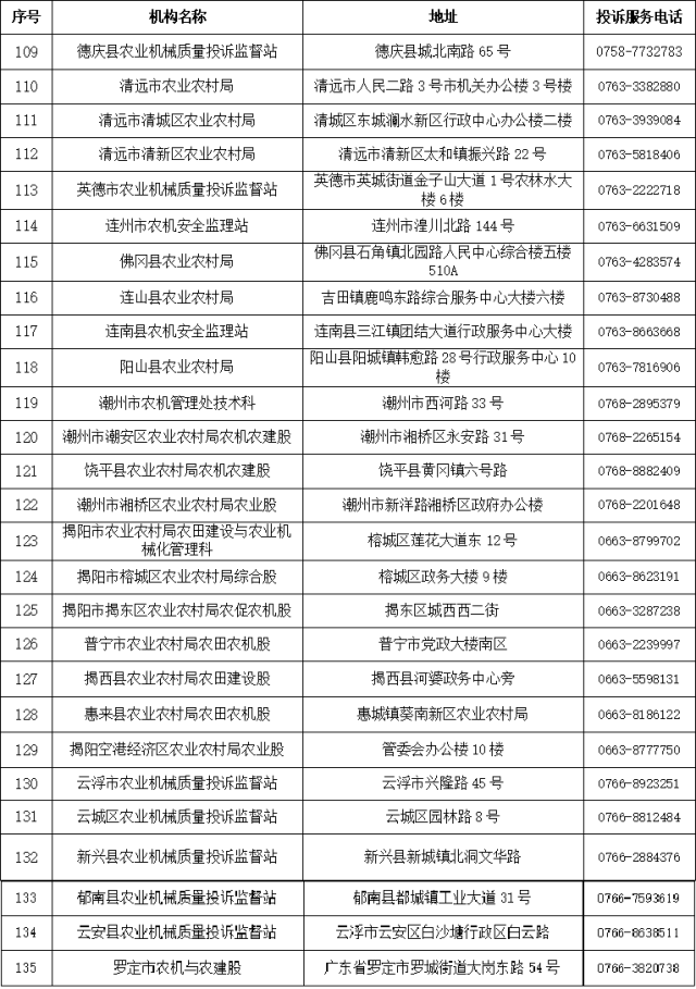 广东省、市、县(市、区)农机质量投诉监督机构信息表