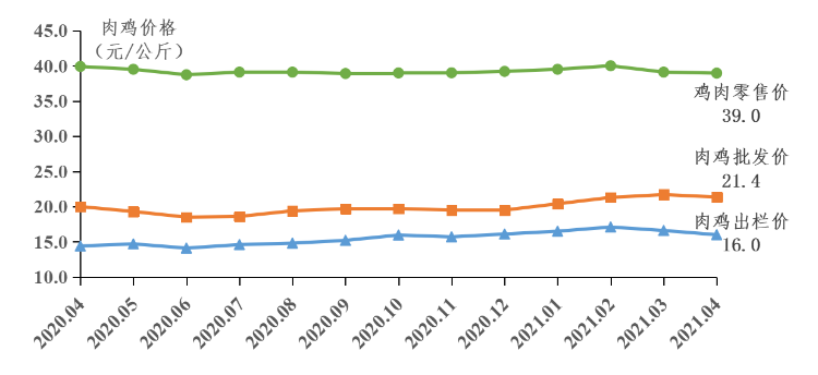 肉鸡价格稳中有降。本月我省家禽市场消费力度仍然较弱,肉鸡上下游价格小幅下降。据省农业信息监测体系数据,本月我省肉鸡出栏价为16.0元/公斤,环比下降3.6%;肉鸡市场批发价为21.4元/公斤,环比下降1.6%;据地市“菜篮子”价格数据,鸡肉零售价为39.0元/公斤,环比下降0.4%。
