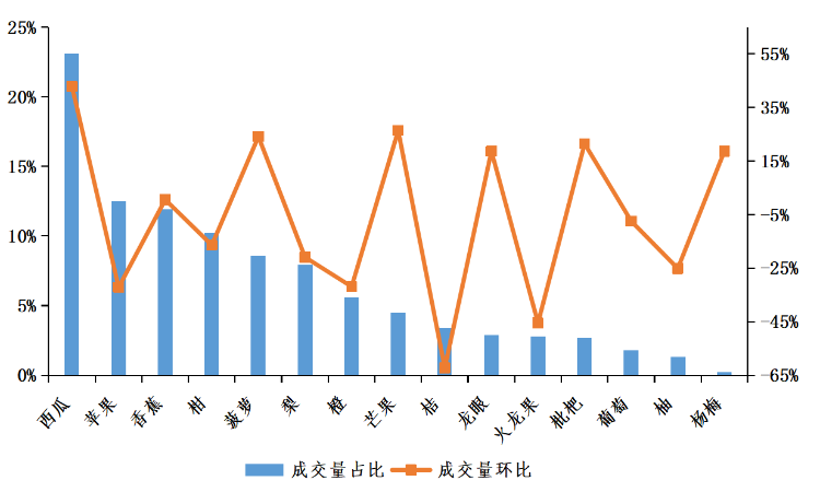 批发市场水果总成交量环比下降8.3%,省内主要批发市场成交量占比前三的水果是西瓜、苹果和香蕉,占比分别为23.1%、12.5%和11.9%。4月成交量环比增幅前三的水果分别是西瓜、芒果和菠萝,成交量环比分别增长42.8%、26.3%和24.1%;桔、火龙果和苹果的成交量降幅较大,环比分别下降62.3%、45.5%和32.2%。