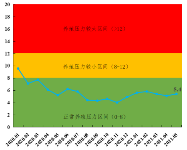 养殖压力指数小幅增加。5月生猪养殖整体稳定,生猪养殖死淘量整体环比下降4.3%,但肉猪养殖死淘量环比增加5%以上,养殖压力指数增加,据省农业信息监测体系数据,平均水平为5.4,较上月增加0.3,但仍处于正常养殖压力区间,能稳定生猪生产。
