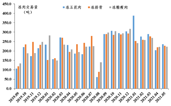 冻猪肉批发量增加。据省农业信息监测体系数据,冻精瘦肉、冻排骨和冻五花肉批发量环比分别增长0.5%、3.7%和15.2 %。