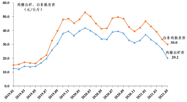 肉猪出栏价、白条肉批发价走势图