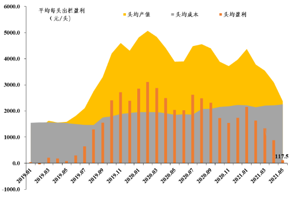养殖成本微涨,肉猪头均盈利大幅下降。5月饲料价格上涨,养殖成本微涨,基地养殖盈利下降。据省农业信息监测体系数据,肉猪养殖成本19.2元/公斤,环比增长1.1%,自繁自养基地出栏肉猪头均盈利117.5元,环比下降86.7%。