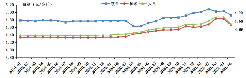 批发市场大米价格下降,但好于去年同期。据省农业信息监测体系数据,本月大米批发均价为4.68元/公斤,环比下降4%,同比上涨4.4%。其中籼米批发价格4.66元/公斤,环比下降3.4%,同比上涨4.8%;粳米批发价格4.92元/公斤,环比下降2.3%,同比上涨6.2%。