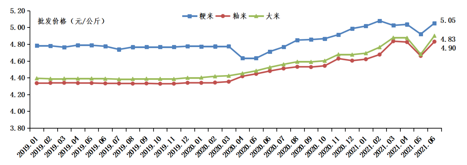 批发市场大米价格上涨。据省农业信息监测体系数据,本月大米批发均价为4.9元/公斤,环比上涨4.7%,同比上涨8.3%。其中籼米批发价格4.83元/公斤,环比上涨3.6%,同比上涨7.8%;粳米批发价格5.05元/公斤,环比上涨2.6%,同比上涨7.2%。