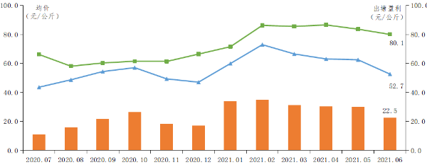 南美白对虾出塘均价下降。6月60条/公斤的南美白对虾出塘均价降至52.7元/公斤,环比下降15.8%,出塘成本为30.1元/公斤,环比下降7.3%,出塘盈利为22.5元/公斤,环比下降25.0%。