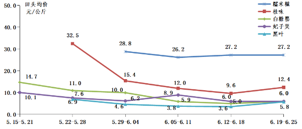 糯米糍行情稳定,桂味价格先降后升。截至6月25日,本月规模化示范基地妃子笑、白糖罂、桂味、黑叶、糯米糍和怀枝田头均价分别为7.7元/公斤、9.7元/公斤、12.0元/公斤、4.0元/公斤、27.0元/公斤和6.0元/公斤。6月初荔枝进入上市高峰期,随着上市进度加快行情下降,6月底荔枝上市季渐入尾声,供应量下降,加之省内市场营销活动力度不断加大,桂味田头行情回升,糯米糍价格保持稳定。