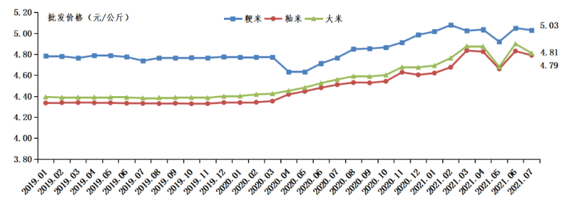 批发市场大米价格下降。据省农业信息监测体系数据,本月大米批发均价为4.81元/公斤,环比下降1.8%,同比仍上涨5.5%。其中籼米批发价格4.79元/公斤,环比下降0.8%,同比仍上涨6.2%;粳米批发价格5.03元/公斤,环比下降0.4%,同比仍上涨7.2%。