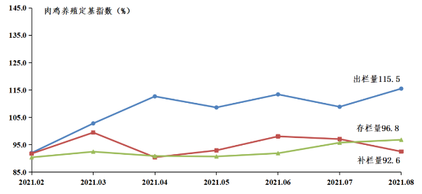 肉鸡存栏量增加。8月我省肉鸡养殖基地生产稳定,存栏增加。据省农业信息监测体系数据,月末肉鸡存栏量环比增长1.1%,同比增长3.9%,8月存栏量定基指数为96.8%,比上月增加1.0个百分点,其中中速型肉鸡(60~90天,下同)存栏量环比下降1.8%,慢速型肉鸡(>90天,下同)存栏量环比增长1.2%。