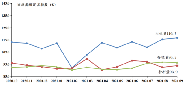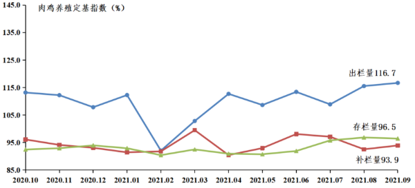 肉鸡存栏量减少。9月我省肉鸡养殖基地生产稳定,存栏稳中有降。据省农业信息监测体系数据,月末肉鸡存栏量环比下降0.4%,同比增长10.0%,9月存栏量定基指数[ 以2019年1月末肉鸡存栏量为基期,说明2021年肉鸡存栏量变化情况。下同。]为96.5%,比上月减少0.4个百分点,其中快速型肉鸡(<60天,下同)存栏量环比增长1.3%,中速型肉鸡(60~90天,下同)存栏量环比下降0.8%,慢速型肉鸡(>90天,下同)存栏量环比下降0.2%。