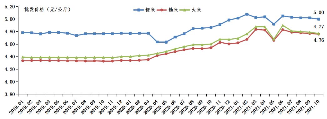 批发市场大米价格环比下降。据省农业信息监测体系数据,10月大米批发均价为4.77元/公斤,环比略降0.4%,同比上涨3.3%;其中籼米批发价格为4.76元/公斤,环比略降0.2%,同比上涨3.48%;粳米批发价格为5.00元/公斤,环比下降0.4%,同比上涨2.7%。