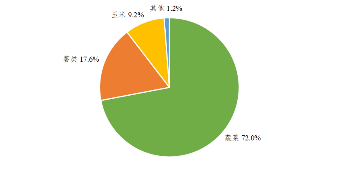 12月我省晚稻颗粒归仓,据基点县监测数据,基点县冬种作物以蔬菜为主,占冬种作物种植总面积的72.0%,蔬菜主要包括叶菜、辣椒、番茄等;其次是薯类,占比为17.6%,主要包括马铃薯、番薯等;玉米种植面积占比为9.2%。