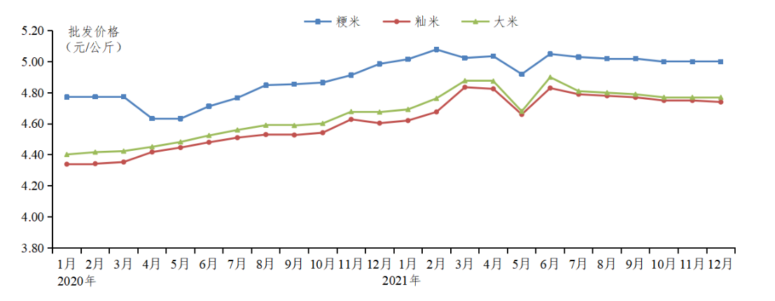 批发市场大米价格环比持平,同比上涨。据省农业信息监测体系数据,12月大米批发均价为4.77元/公斤,环比持平,同比上涨2.1%;其中籼米批发价格为4.74元/公斤,环比微跌0.2%,同比上涨2.2%;粳米批发价格为5.00元/公斤,环比、同比均持平。