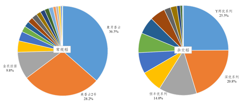 据基点县监测数据,预计2022年广东省早稻种植面积为1304.7万亩,同比增加0.5%,2月下旬将逐步进入早稻种植期。意向种植面积前三的早稻常规稻品种分别为象牙香占、美香占2号、金农丝苗,占比分别为36.5%、28.2%、9.8%;意向种植面积排名前三的早稻杂交稻分别为Y两优、深优和恒丰优系列,占比分别为25.5%、20.8%、14.0%。