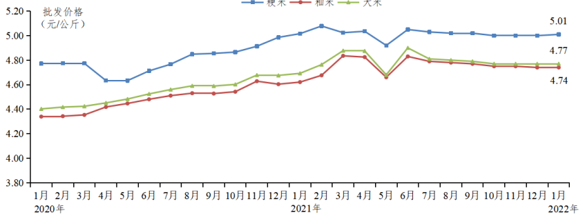 批发市场大米价格环比持平,同比上涨。据省农业信息监测体系数据,1月大米批发均价为4.77元/公斤,环比持平,同比上涨1.5%;其中籼米批发价格为4.74元/公斤,环比持平,同比上涨1.5%;粳米批发价格为5.01元/公斤,环比微涨0.2%,同比微跌0.2%。