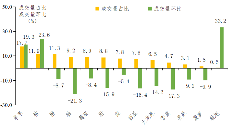 批发市场水果成交量环比增加。据省农业信息监测体系数据,省内批发市场水果总成交量环比增加7.5%,主要批发市场成交量排名前三的水果是苹果、桔、橙,占比分别为17.7%、11.9%和11.3%;成交量环比增幅前三的水果是枇杷、桔和苹果,环比分别增加33.2%、23.6%和19.3%;成交量环比降幅较大的水果是柚、香蕉和西瓜,环比分别下降21.3%、17.3%和16.4%。