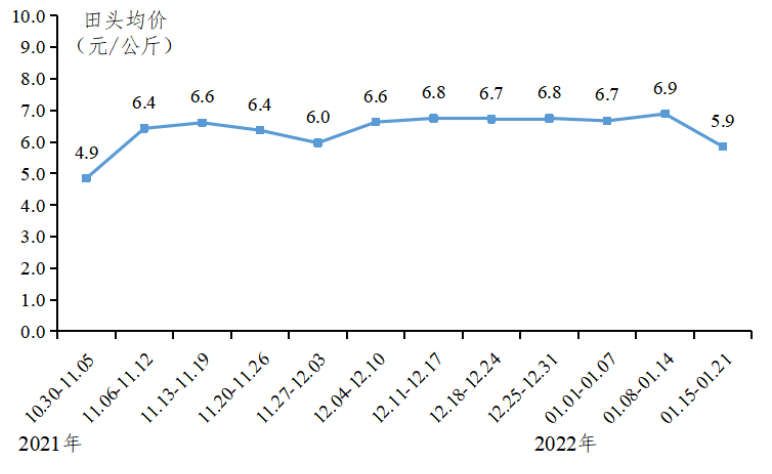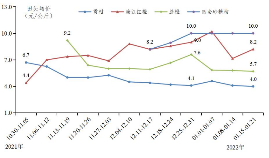 柑橘大量上市,行情涨跌互现。据省农业信息监测体系数据,全省规模化柑橘生产基地柑橘田头均价为7.9元/公斤,环比上涨20.7%。其中,贡柑田头均价为4.1元/公斤,环比下降11.4%;廉江红橙田头均价8.6元/公斤,环比上涨2.3%;脐橙田头均价5.8元/公斤,环比下降4.5%;砂糖桔田头均价为3.6元/公斤,环比上涨16.0%,小部分规模基地优质果田头均价达10.0元/公斤;年桔于1月中旬开始大量上市,田头均价为3.6元/公斤,同比上涨33.3%;蕉柑开始上市,本季产量约为10.9万吨,田头均价为5.0元/公斤。