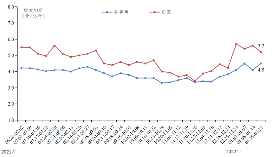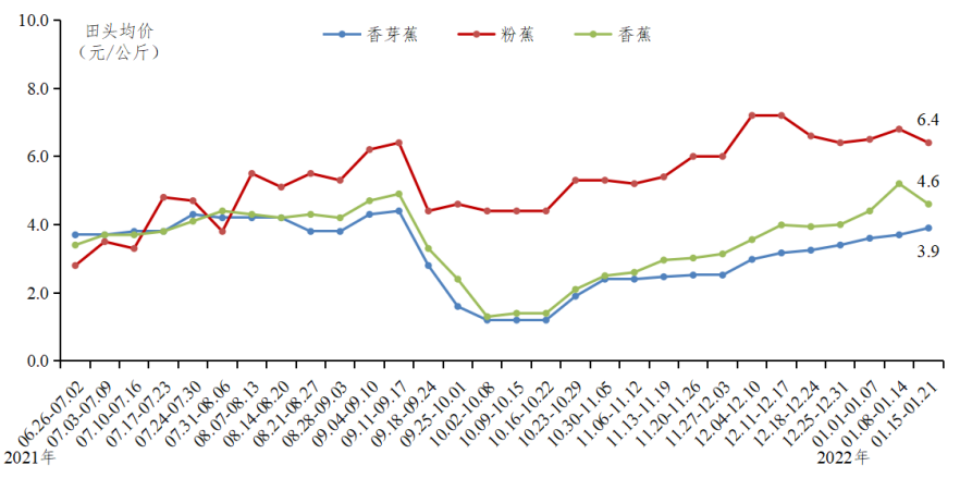 香芽蕉田头均价持续拉升。1月受春节带动,客商备货积极,加之目前香蕉供应量偏少,香芽蕉行情持续上涨。据省农业信息监测体系数据,规模化示范基地香蕉田头均价为4.5元/公斤,其中香芽蕉田头均价为3.7元/公斤,环比上涨23.1%;粉蕉田头均价为6.6元/公斤,环比略降1.4%。