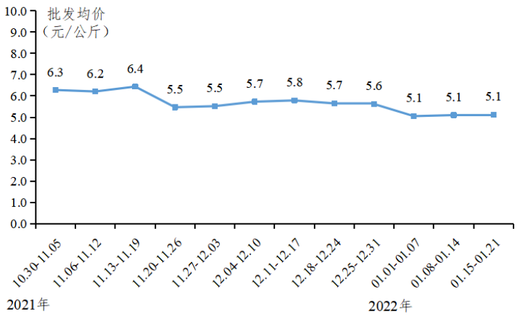 菠萝产量微增,1月上市进度放缓。2022年广东菠萝预计种植面积58.6万亩,生产规模保持稳定。本季菠萝整体生产形势良好,全省菠萝预计产量123.3万吨,同比增长1.1%。其中徐闻菠萝预计产量70万吨(注:总产量后期会有变动,主要受降雨量和耕种管理影响);雷州菠萝预计产量39.9万吨,同比增长3.1%。受国内新冠肺炎疫情散发影响,菠萝上市进度放缓。1月广东菠萝上市进度约7.7%,上市量较去年同期下降22.5%,预计上市高峰期在3-4月,供应较2021年更为集中,销售压力相应增加。
