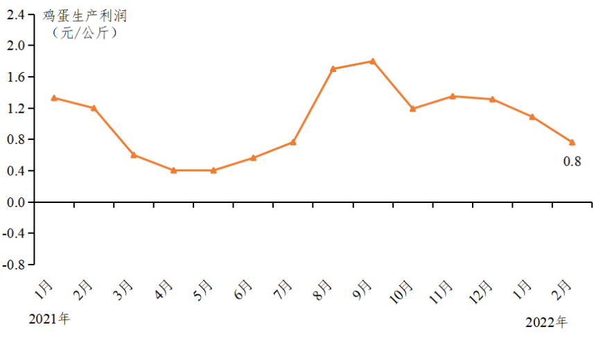 蛋鸡鸡苗均价为3.8元/羽,环比下跌0.1元/羽;鸡蛋生产成本为9.5元/公斤,环比上涨0.2%;2月平均盈利0.8元/公斤,利润率为7.5%,较上月下降2.8个百分点。