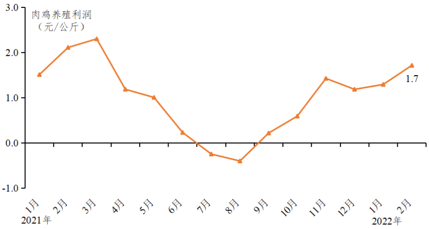 饲料价格居高不下,肉鸡养殖成本和鸡蛋生产成本均稳中有涨。据省农业信息监测体系数据,肉鸡母鸡苗价为3.4元/羽,环比持平;肉鸡养殖成本为16.6元/公斤,环比上涨1.9%;2月平均盈利1.7元/公斤,利润率为9.4%,较上月增加2.0个百分点;其中,快、中、慢速型肉鸡分别盈利3.6元/公斤、1.1元/公斤和1.9元/公斤。