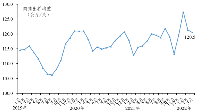 猪出栏均重下降。本月肉猪出栏均重回落,3月肉猪出栏均重为120.5公斤/头,环比下降0.7%。130公斤/头以上占比为22.1%,较上月下降1.4个百分点。