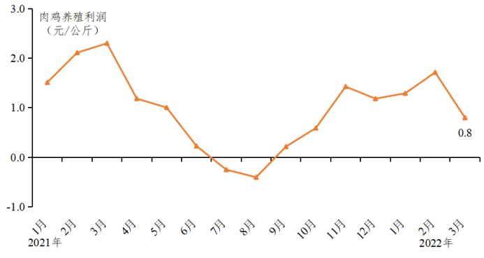 3月饲料原料持续位居高位,养殖端生产成本上涨,盈利下降。据省农业信息监测体系数据,规模基地肉鸡养殖成本为16.7元/公斤,环比上涨0.9%,盈利0.8元/公斤,利润率为4.6%,较上月下降4.8个百分点。