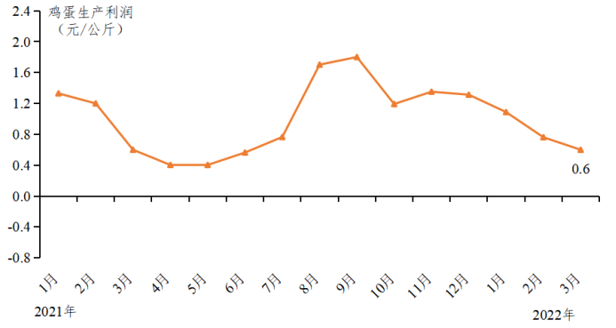 鸡蛋生产成本为9.6元/公斤,环比上涨1.4%,盈利0.6元/公斤,利润率为6.3%,较上月下降1.2个百分点。