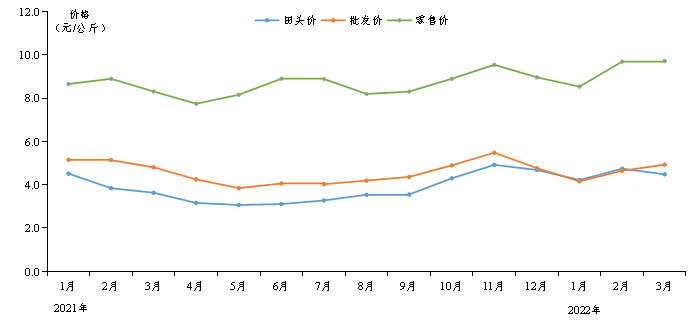 与上季度相比,我省蔬菜田头价、批发价均下跌;田头价与去年同期相比价格仍在高位。据省农业信息监测体系数据,监测的主要蔬菜第一季度加权田头价为4.49元/公斤,较上季度下跌3.3%,同比上涨12.1%。加权批发价为4.58元/公斤,较上季度下跌9.3%,同比下跌9.0%。零售均价9.32元/公斤,较上季度上涨2.0%,同比上涨8.0%。