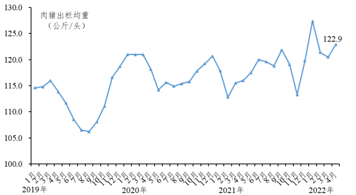 肉猪出栏均重上升。4月肉猪出栏均重为122.9公斤/头,环比增长2.0%。130公斤/头以上占比为18.6%,较上月下降3.5个百分点。