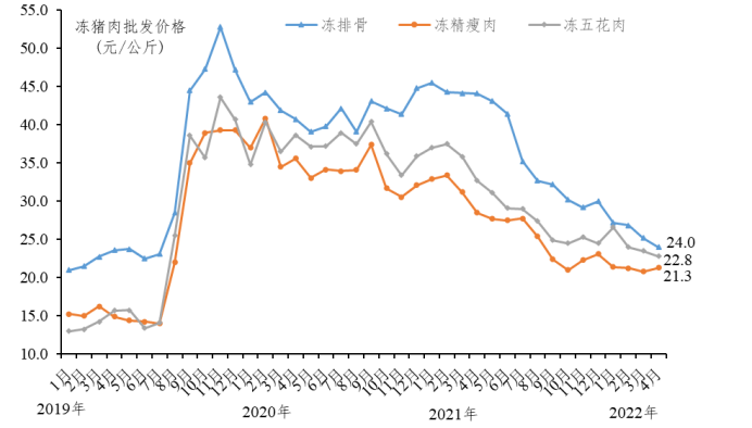 白条肉批发价降至19.7元/公斤,环比下降1.9%,同比下降41.6%。冻排骨、冻五花肉批发价环比分别下降4.8%、3.0%,冻精瘦肉批发价环比上涨2.3%。