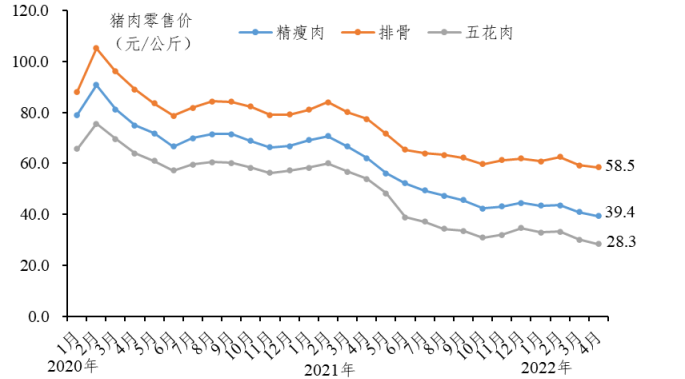 猪肉零售价下降,据地市“菜篮子”数据,排骨均价、精瘦肉均价和五花肉均价环比分别下降1.5%、3.7%和6.0%,同比均下降10%以上。