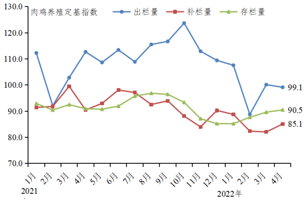 广东规模基地肉鸡存栏、出栏、补栏定基指数走势图