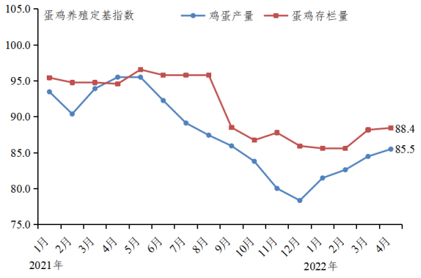 广东规模基地蛋鸡存栏量和鸡蛋产量定基指数走势图