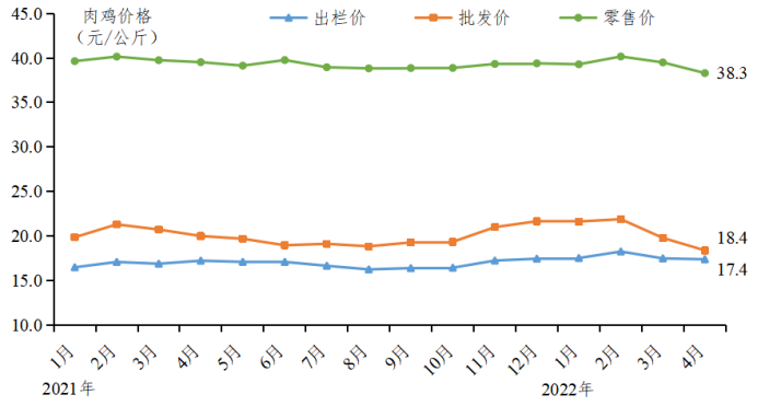 肉鸡价格回落。4月在新冠肺炎疫情及低猪价影响下,肉鸡价格下降。据省农业信息监测体系数据,肉鸡出栏价为17.4元/公斤,环比下降0.6%,批发价为18.4元/公斤,环比下降7.1%。据地市“菜篮子”数据,白条鸡零售价为38.3元/公斤,环比下降3.0%。