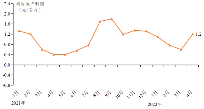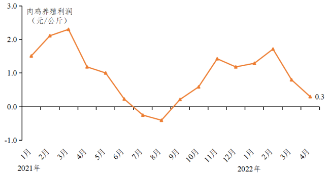 4月饲料原料持续位居高位,养殖短生产成本上涨,肉鸡养殖盈利下降,鸡蛋养殖盈利增加。据省农业信息监测体系数据,肉鸡养殖成本为17.1元/公斤,环比上涨2.4%,盈利0.3元/公斤,利润率为1.7%,较上月下降2.8个百分点。