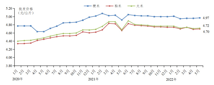 农民出售晚籼稻和籼米价格下降。据省农业信息监测体系数据,5月农民出售的晚籼稻、米价格均有一定幅度下降,晚籼稻出售价格为160.5元/百斤,环比下降5.2%,晚籼米出售价格为6.06元/公斤,环比下降3.2%。