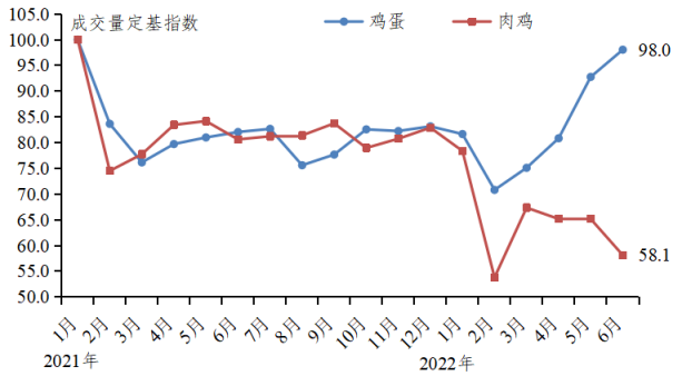 6月我省主要批发市场肉鸡流通量总体下降,鸡蛋流通量整体增加。据省农业信息监测体系数据,肉鸡批发市场成交量环比下降10.8%,鸡蛋成交量环比增加5.7%,其定基指数[ 定基指数:以该指标2021年1月数据为基期水平100。]分别为58.1、98.0。根据统计局人均禽肉、禽蛋消费量计算,全省6月禽肉消费量32.02万吨,禽蛋消费量9.98万吨。