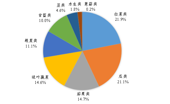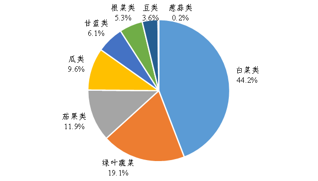 蔬菜播种面积稳中略增。去冬今春我省及时做好蔬菜等农产品稳产保供工作部署,农户种植意向高,生产积极,一季度全省蔬菜稳步增加,冬种菜北运供应充足。5月以来降雨频繁,部分地区蔬菜生产受到雨水影响,预计上半年蔬菜播种面积1034.1万亩,同比略增0.2%。据省农业信息监测体系数据,上半年监测的规模化基地蔬菜播种面积较高种类是白菜类、绿叶蔬菜、茄果类和瓜类,播种面积占比分别为44.2%、19.1%、11.9%和9.6%。分品种而言,播种面积排名前三的是菜心、小白菜和辣椒,占比分别是31.8%、7.0%和5.7%。