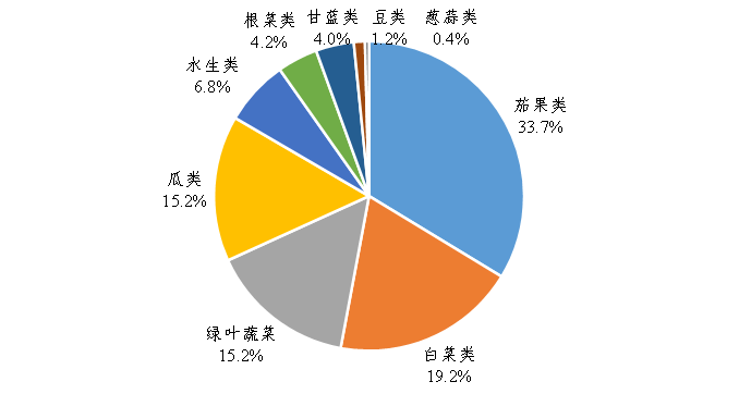 蔬菜产量同比增加。我省切实落实稳产保供工作,蔬菜产量稳定增加。据省农业信息监测体系数据,预计上半年蔬菜总产量1943.71万吨。部分地区受强降雨及受灾影响较大,据规模化基地监测,产量同比增长1.5%,亩产1812.7公斤/亩,同比增长1.8%。上半年监测规模化基地蔬菜产出以茄果类、白菜类、绿叶蔬菜和瓜类为主,产量占比分别为33.7%、19.2%、15.2%和15.2%。分品种而言,产量排名前三为辣椒、菜心和马蹄,占比分别为26.0%、13.3%和6.8%。