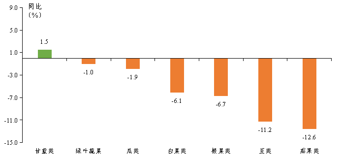 批发市场大部分蔬菜品种成交量减少,其中茄果类、豆类、根菜类和白菜类蔬菜减少明显,同比降幅均在6%以上。交易量同比降幅较大的品种有辣椒、大白菜和四季豆,交易量增加的仅有甘蓝类,同比增长1.5%,其中芥兰和西兰花成交量同比分别增长16.7%和8.0%。