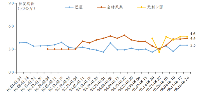 上半年巴厘菠萝田头价整体平稳,巴厘菠萝田头均价2.4元/公斤,同比下降4.0%,走势总体平稳;金钻凤梨、神湾菠萝保持较好价格水平,至6月中下旬受降雨影响,行情有一定回落。